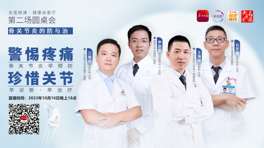 10月16日18:00,广州日报健康有约“名医微课-健康会客厅”圆桌会科普专题邀请了广州中医药大学第一附属医院大骨科主任王海彬、广州医科大学附属第二医院脊柱外科主任江晓兵、暨南大学附属第一医院运动医学中心主任李劼若、广州市番禺区中医院关节外科主任石宇雄就“骨关节炎的防与治”分享真知灼见,一起来听听他们说了些什么吧——