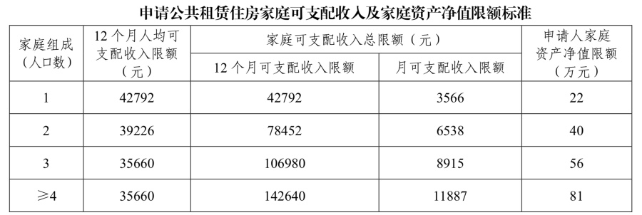 其次,资格复核前12个月家庭可支配收入、资格复核时家庭资产净值符合政府公布的标准。(见下表)