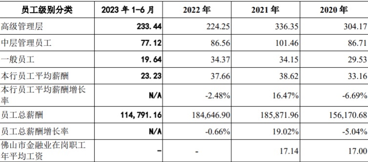 广州日报记者留意到,2023年 1-6月、2022年、2021年和 2020年,顺德农商银行员工人均薪酬分别为 23.23万元、37.66万元、38.62万元和 33.16万元。2023年 1-6月,该行平均员工薪酬有所上升。对此,招股说明书中也做出解释,主要原因为 2023年上半年支付了部分延期支付的薪酬。2022年本行平均员工薪酬基本保持平稳。