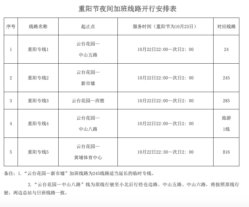其中,从10月22日22:00至10月23日2:00,开行公共汽车云台花园总站至中山五路、新市墟、西塱、中山八路、黄埔体育中心等方向的五条夜间加班线路。