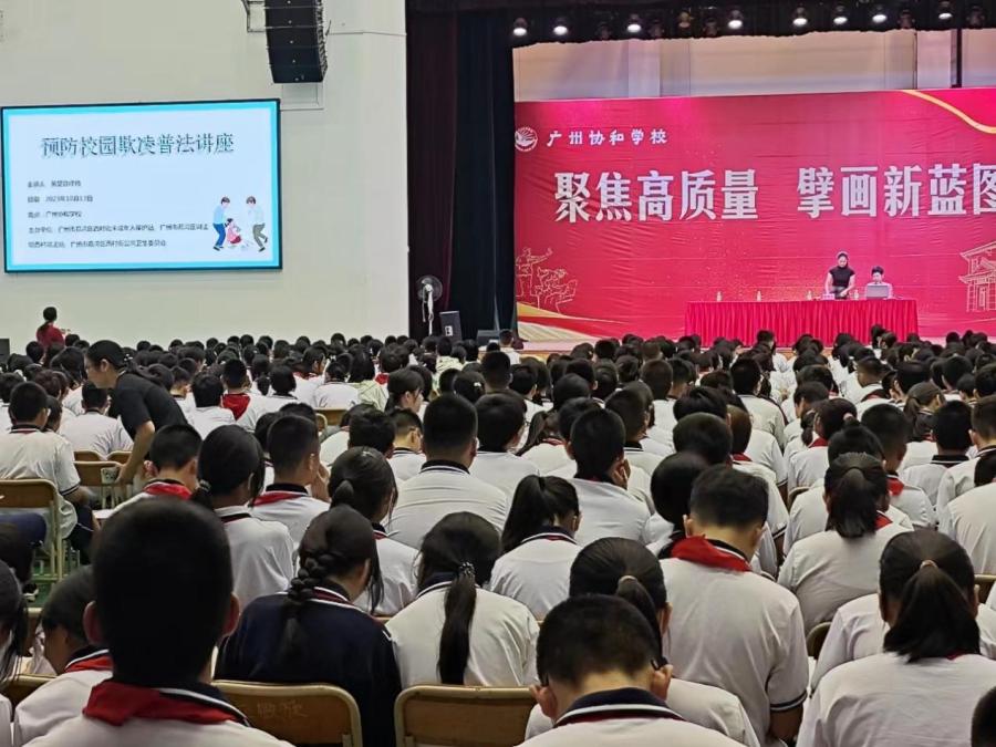“起绰号也能对人造成伤害”“欺负同学要承担法律责任”......10月17日,广州荔湾区西村街公共卫生委员会、西村街道未成年人保护站、西村街司法所、联合广州市协和中学,面向初中全体学生开展预防校园欺凌普法讲座。活动吸引700名中学生参加,旨在引起师生对校园欺凌行为的重视,守护未成年人身心健康成长。