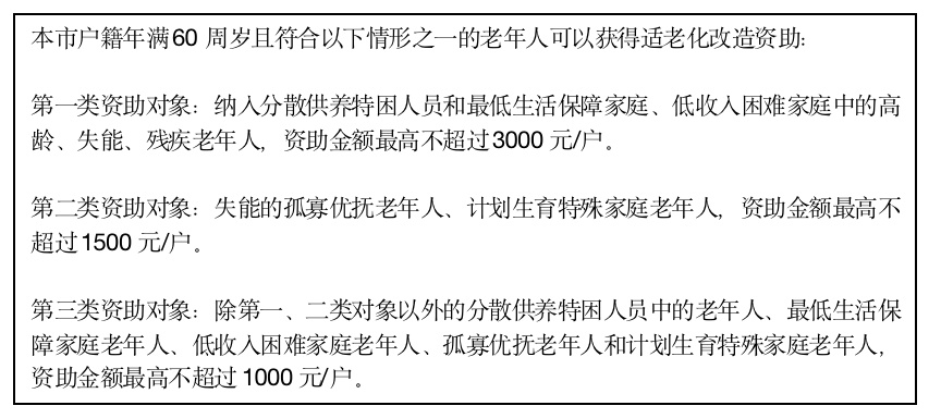 在保障标准方面,对新建床并经全市统一评估为老年人照护需求等级1-5级且老年人能力等级1级以上的广州市户籍老年人连续提供服务满12个月,且经所在区民政部门核实合格的家庭养老床位,以每张床位适老化改造项目不超过1500元、智能化改造设备不超过1500元的标准,在实际改造费用的范围内给予一次性建床资助。同一老年人只计1次建床资助。