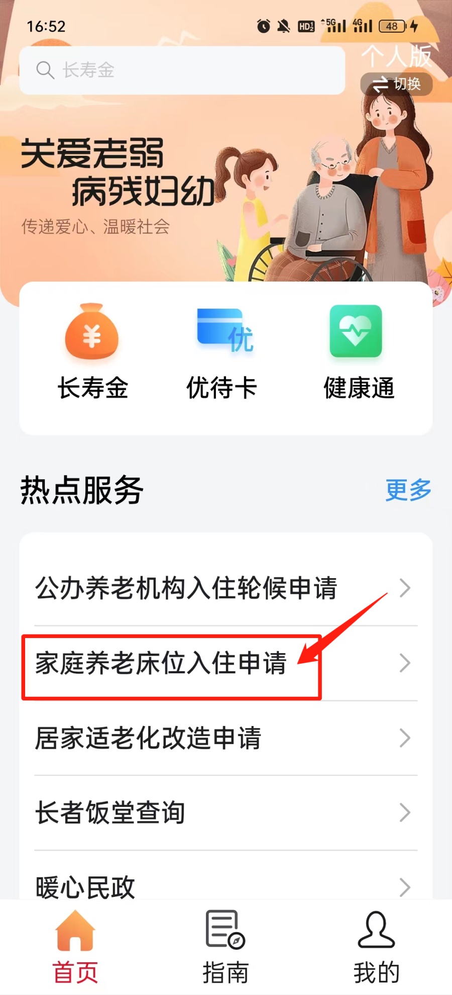 在各大应用市场搜索下载“穗好办”APP,在“穗好办”APP首页,点击右上角“关爱版”图标,首页下方点击【家庭养老床位入住申请】即可进入申请办理。