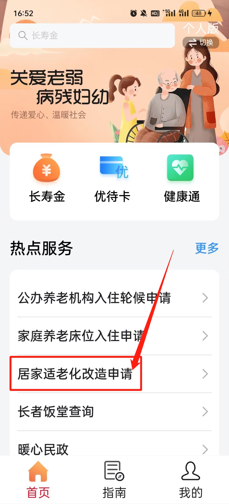 在各大应用市场搜索下载“穗好办”APP,在“穗好办”APP首页,点击右上角“关爱版”图标,首页下方点击【居家适老化改造申请】即可进入申请办理。