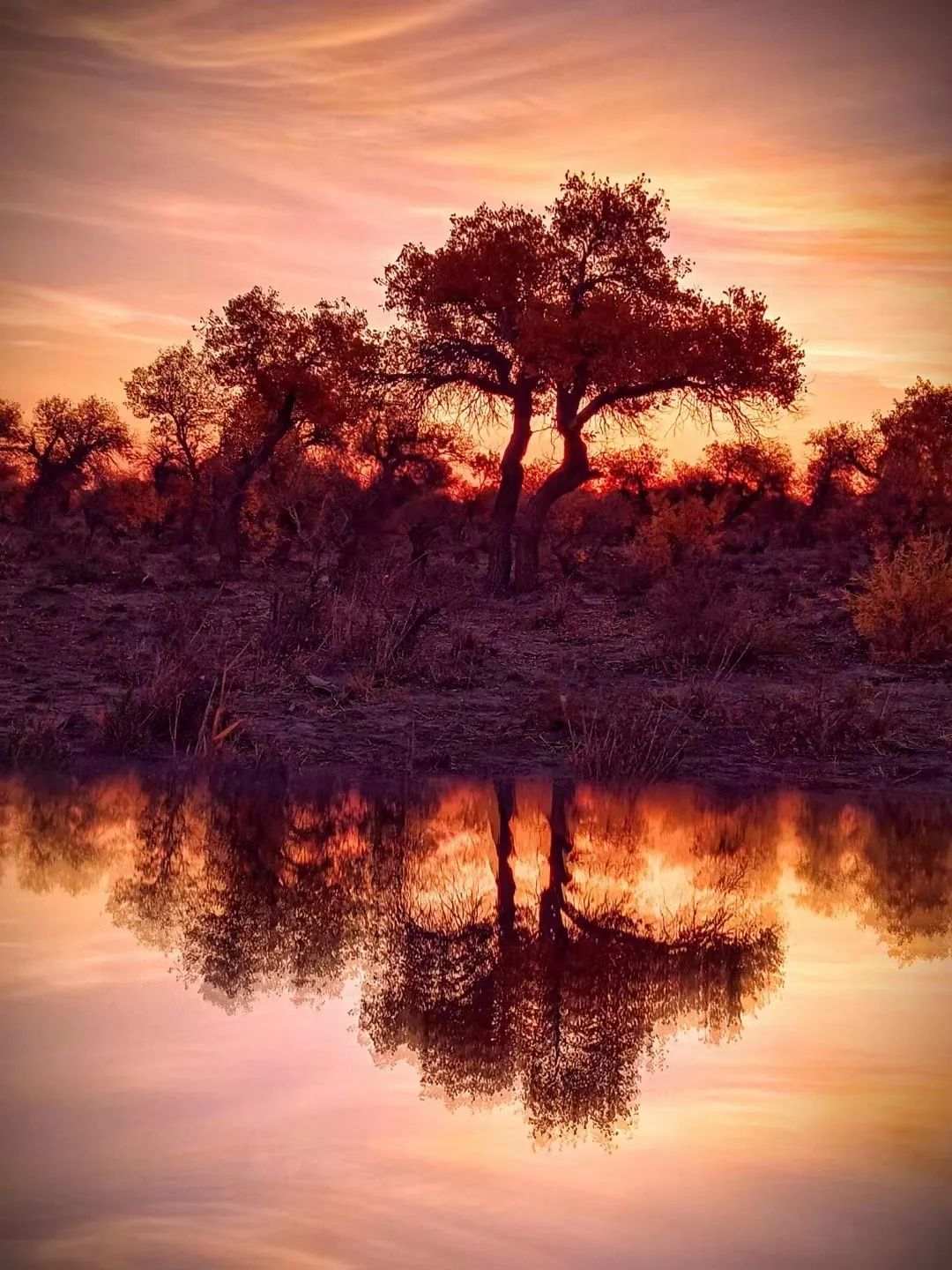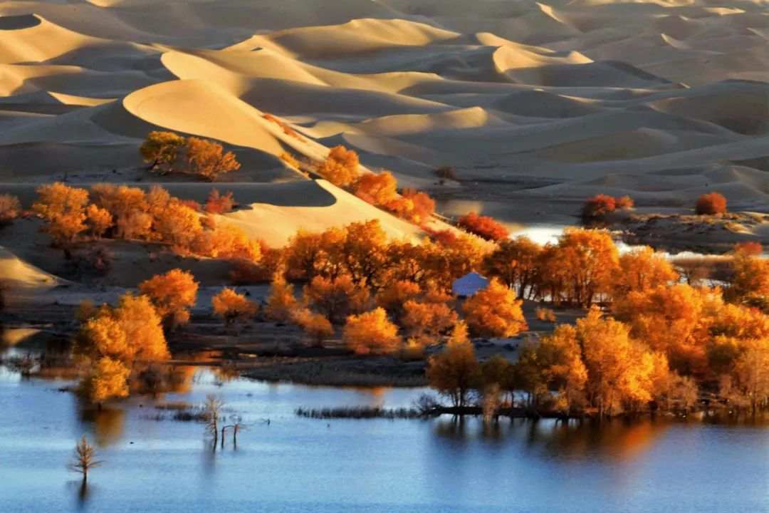 40余万亩胡杨林与河流、沙漠、戈壁、绿洲、沙湖、古道融为一体,极其壮观。