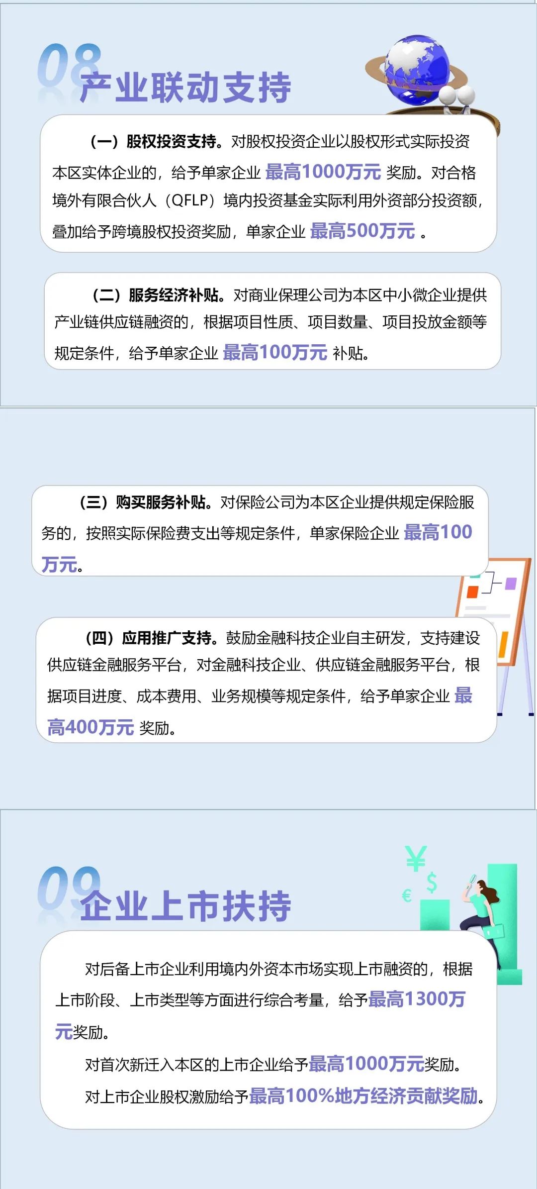 “金融15条”通过股权投资支持,对股权投资企业投资本区实体企业的,最高给予1000万元奖励。对QFLP基金实际利用外资的投资额,叠加给予最高500万元奖励。