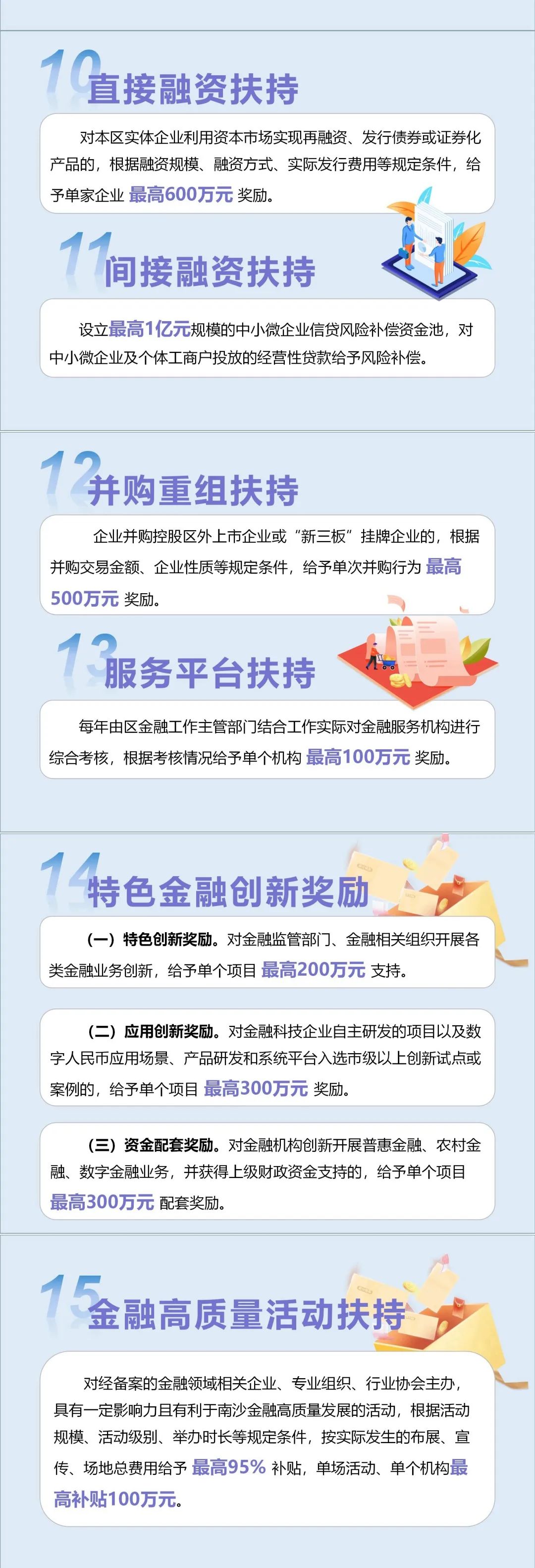 另外,为全方位提升南沙金融的国际吸引力,营造金融交流合作良好氛围,“金融15条”通过活动论坛补贴,对金融领域相关企业、专业组织、行业协会在本区主办的有利于南沙金融高质量发展的活动,最高给予100万元扶持,塑造南沙金融活动品牌,增强活动磁吸效应。