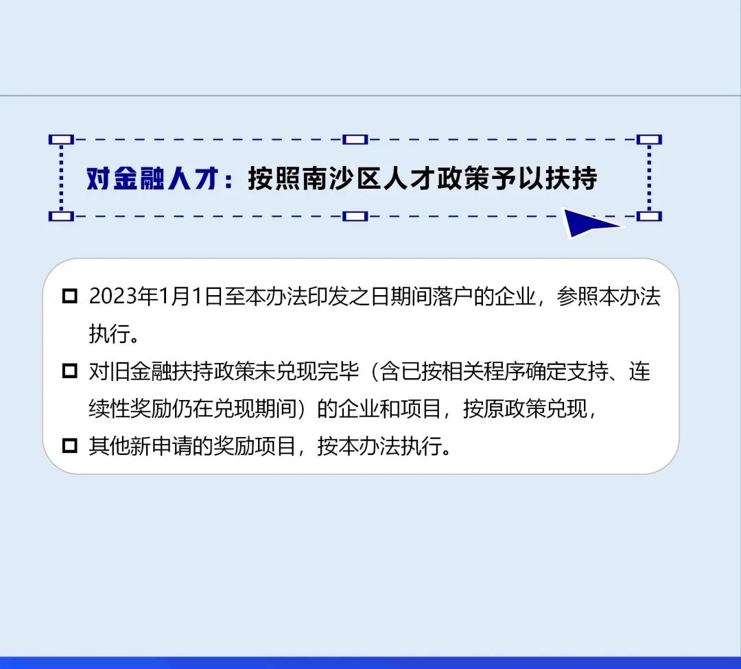 据悉,2017年南沙出台的《广州南沙新区(自贸片区)促进金融服务业发展扶持办法》(下称“前期金融政策”)已于2022年12月31日到期。此次“金融15条”规定2023年1月1日至本办法印发之日期间落户的企业,参照本办法执行,是与“前期金融政策”的无缝衔接。