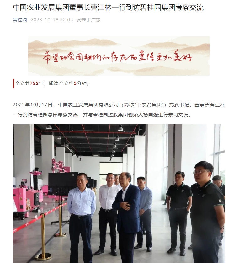 据碧桂园18日发布的消息称:10月17日,中国农业发展集团有限公司党委书记、董事长曹江林一行到访碧桂园总部考察交流,并与碧桂园控股集团创始人杨国强进行亲切交流。