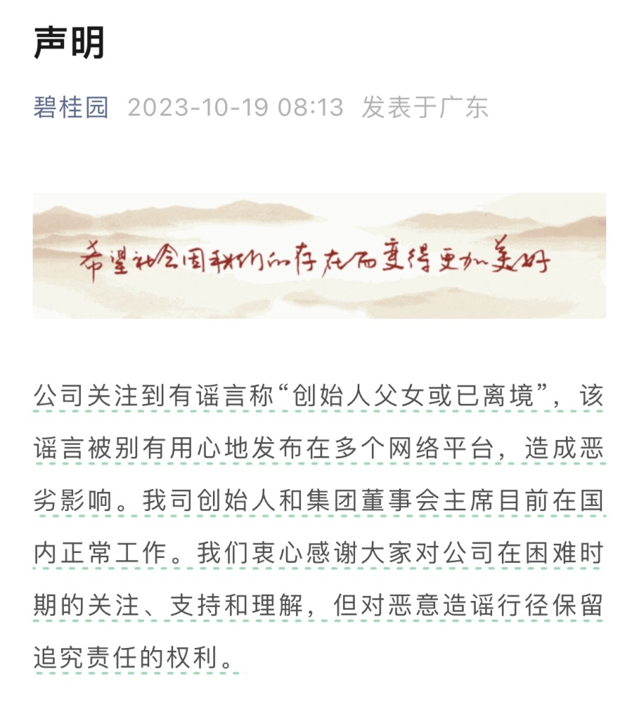 碧桂园表示,公司创始人和集团董事会主席目前在国内正常工作。“我们衷心感谢大家对公司在困难时期的关注、支持和理解,但对恶意造谣行径保留追究责任的权利。”公司声明称。