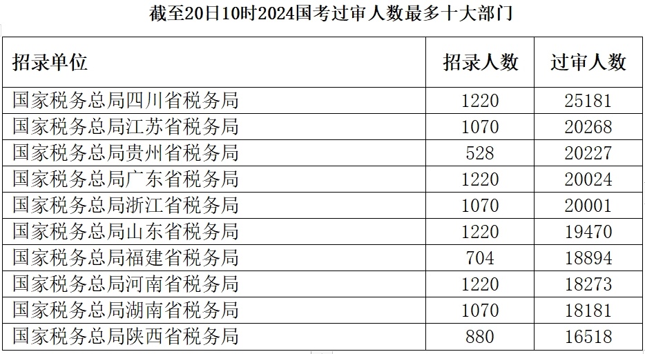 从各部门的报名数据来看,国家税务总局四川省税务局依然以过审25181人的绝对优势“称霸”,2024国考过审人数最多十大部门过审人数全部超过15000人。