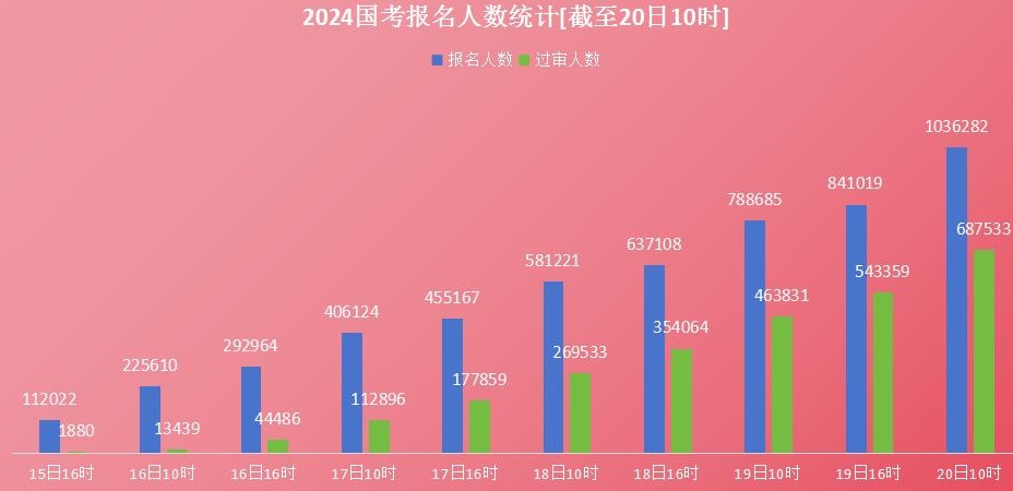 10月20日,2024国考报名进入第6天,也是报名高峰期。根据中公教育的统计,截至当日10时,报名系统共有1036282人提交报名申请,单日增长量高达25万,其中687533人已经通过资格审核,目前,平均竞争比17.37:1,略高于上年同期水平。