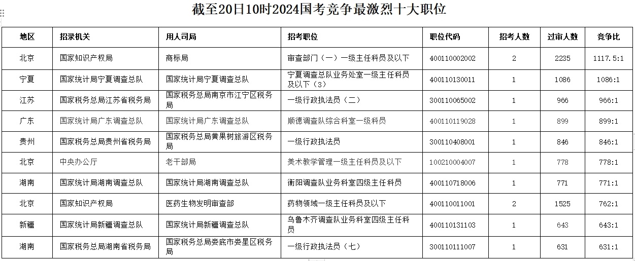 竞争最激烈的部门依然是国家粮食和物资储备局陕西局,已经连续三天稳坐榜首,竞争比为341:1,国家自然资源督察南京局首次跻身亚军之位,实力也很强劲,未来很有赶超的可能。