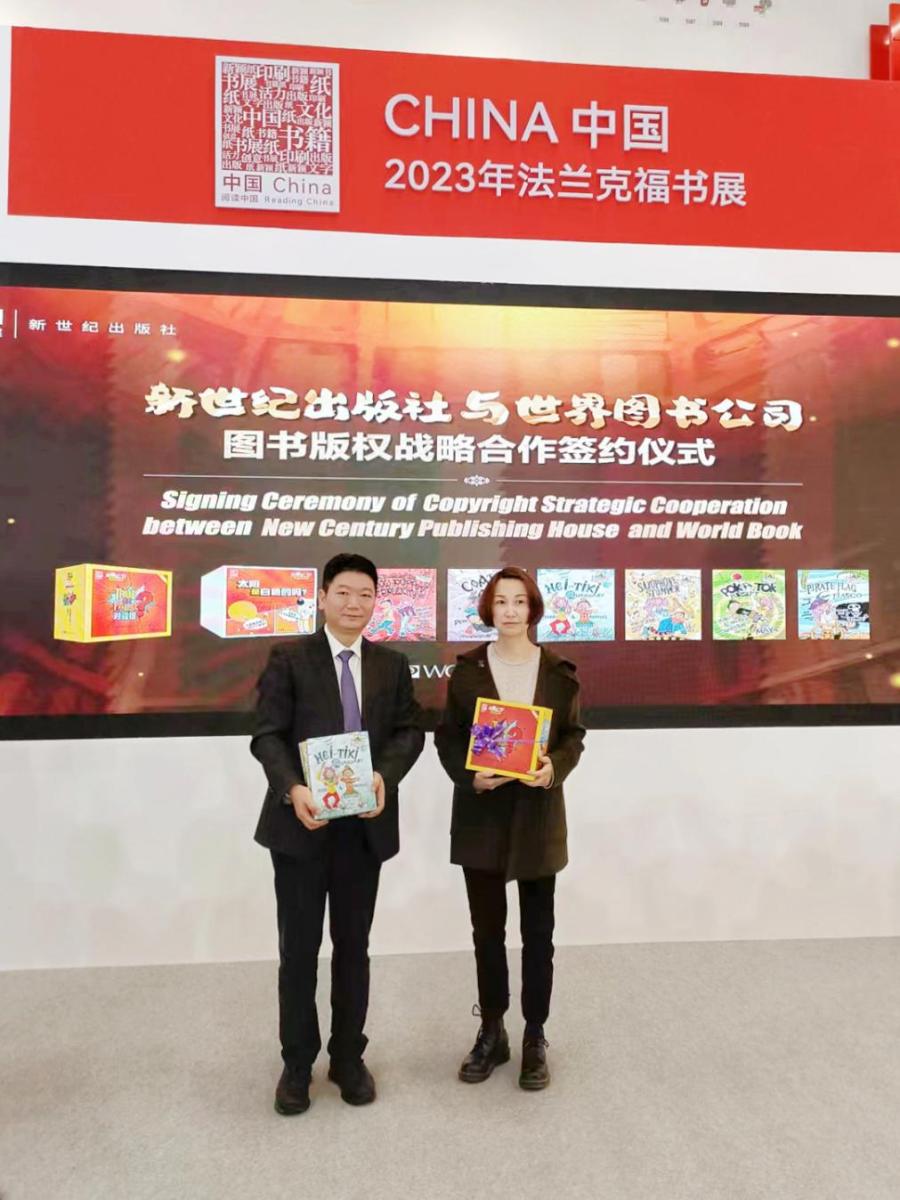 10月18日上午,新世纪出版社与美国世界图书公司图书版权战略合作签约仪式在德国法兰克福书展中国展区内举行。