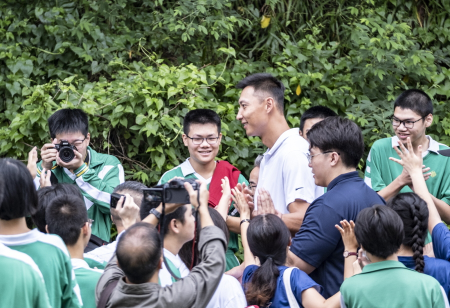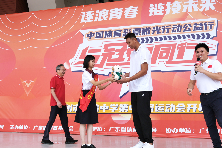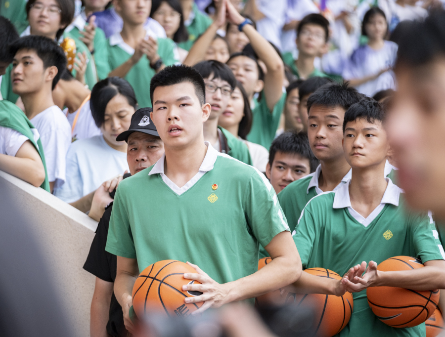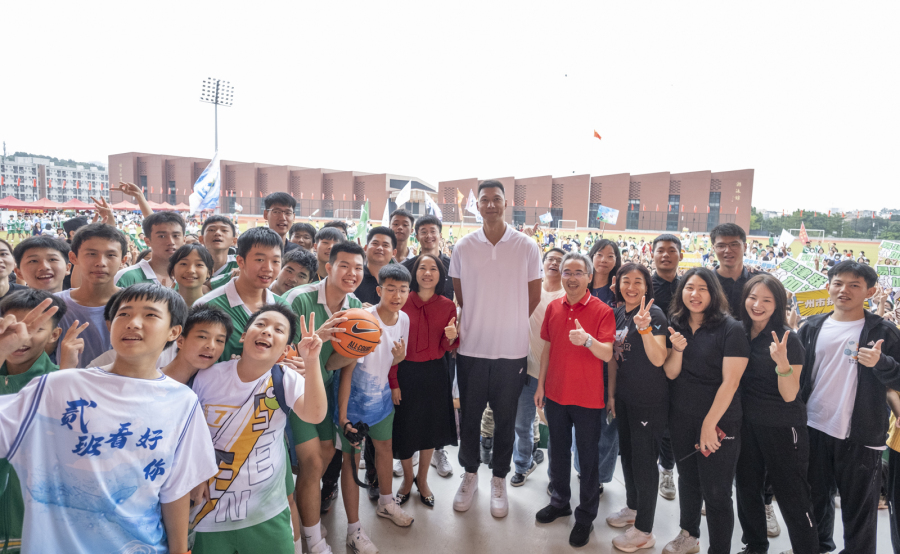 10月20日上午,前中国职业篮球运动员易建联现身广州市执信中学天河校区校运会开幕式,为运动健儿加油助威,与学生分享篮球经历与奋斗故事。他一出场,就收获了执信学子的欢呼与鼓掌。
