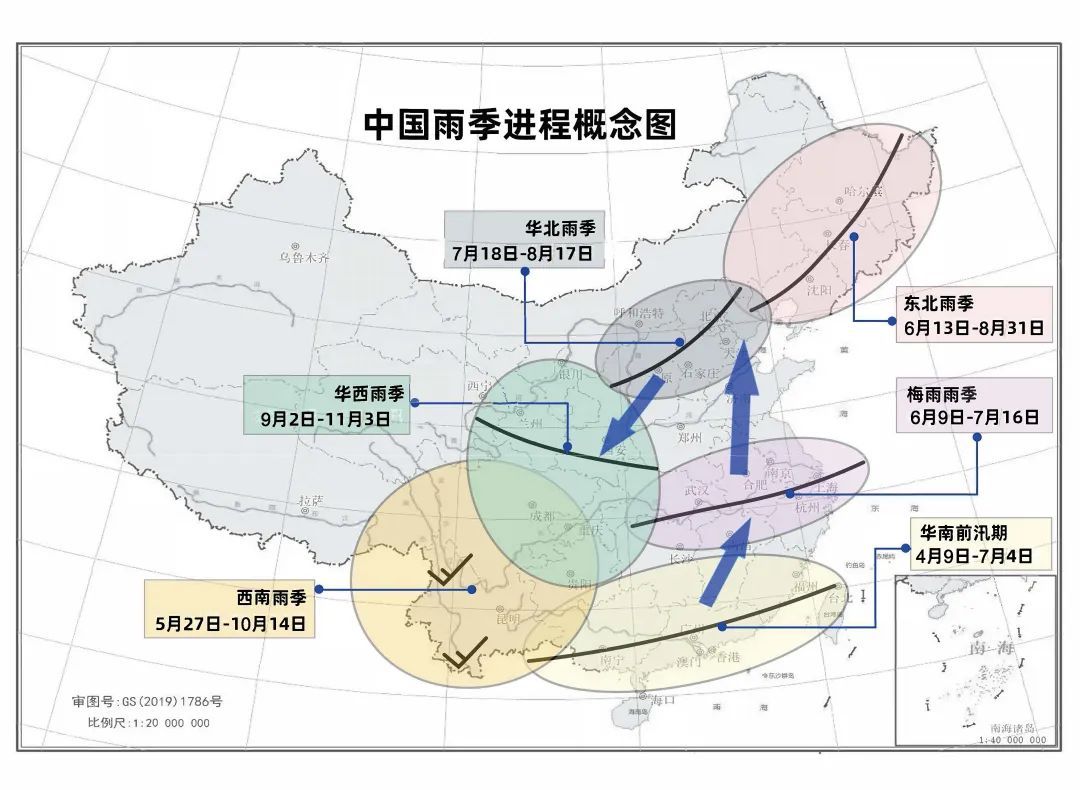 通常在5月中下旬南海季风爆发以后,华南地区降水会明显增加,形成华南前汛期;此后,东亚夏季风开始进入全盛时期,季风雨带加强并向北移动;6-7月,季风雨带主要维持在长江流域,造成当地高温高湿的梅雨季;7-8月,季风雨带向北推进到华北和东北地区,此时进入华北雨季和东北雨季;8月中下旬至9月中旬前后,随着大陆冷空气南下,夏季风开始减弱并一路南撤,此时冷暖气流通常会在华西地区交汇,形成绵绵不断的华西秋雨现象;9月末至10月初,夏季风基本撤出中国东部地区。