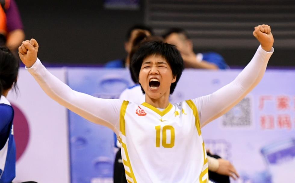 广东队球员黄晓连在全国第十届残运会暨第七届特奥会女子轮椅篮球决赛中庆祝获胜。