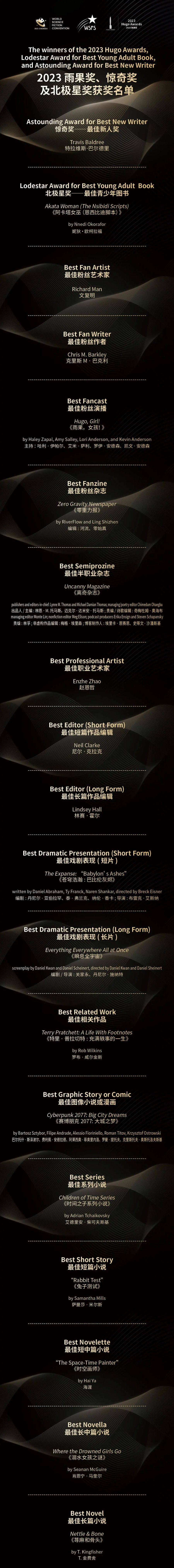 值得关注的是,本次雨果奖名单中,中国作品及人员获得的奖项类别丰富、人数众多,为历届之最,充分体现了中国科幻近年来的发展壮大。