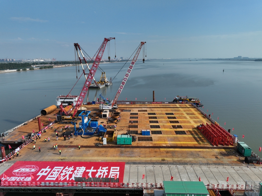 万龙大桥主墩桩基础采用29根直径3米桩,属大直径超深钻孔桩,施工难度大。为克服不利地质条件可能导致钻孔过程中出现孔口坍塌的现象,施工方采取了埋设长钢护筒、拌制高性能泥浆等措施,同时,通过精准控制钻压、超声成孔检测仪检测等手段,确保成桩质量。