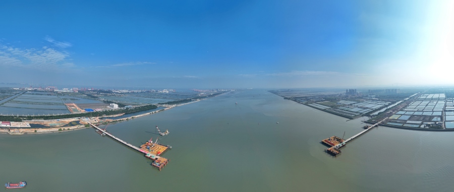 “正式开钻!”10月23日,在蕉门水道开阔江域上,现场作业人员通过对讲机传达指令,机器轰鸣声响起,广州南沙万龙大桥主桥首根桩基开钻,标志着这座世界最大跨度自锚式悬索桥进入主体施工阶段。