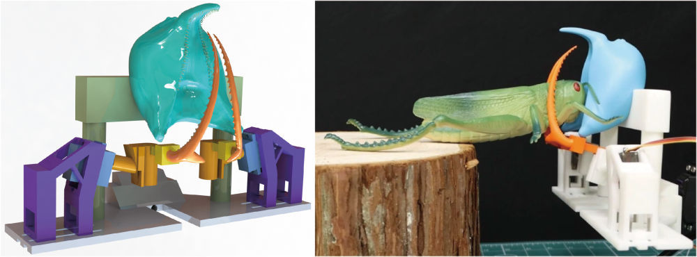 研究中复原的刀颚蚁头部三维模型(左)和验证运动学合理性的实验(右)。(中国科学院南京地质古生物研究所供图)