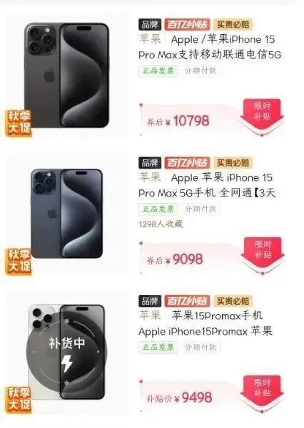 当前,在某电商平台上,iPhone 15 128GB为5198元,256GB为6098元,官方价格分别为5999元和6999元;iPhone 15 Plus 128GB为6148元,256GB为7048元,官方价格分别为6999元和7999元;iPhone 15 Pro 128GB版本为7498元、256GB版本为8048元;官方价格分别为7999元和8999元;iPhone 15 Pro Max 256GB版本为9098元、512GB版本为10798元、1TB版本为13398元。而官方价格分别为9999元、11999元和13999元。