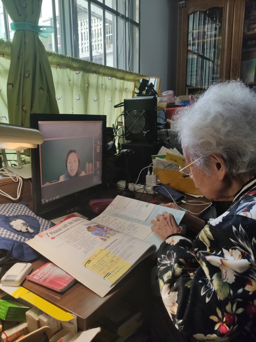 如今的李文英因为行动不便,都是在家上网课,每周二上新概念英语提高班,每周五上剑桥交际英语提高班。“晚上睡不着的时候,母亲就背单词、背语法、唱英文歌,虽然因为耳朵听不见与人讲英语时不是很顺畅,但是她能够流利地读课文,还能给语法书挑错。”李文英的女儿李德汋说,自己在母亲的带动下也一起陪她上这两门英语课,2013年开始她自己还每周两次到广州老年大学晓园校区上瑜伽课。