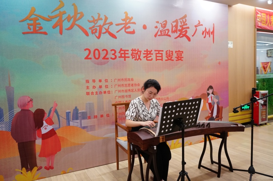 轻柔的旋律流淌而出,广州图书馆馆员和志愿者合作带来的一曲《彩云追月》古筝表演,随后来自广州图书馆专题服务部的馆员用粤语向老人们讲述了重阳节的来源。宴席结束时,多位老人表示活动“有得睇,有得玩,有得食”,内心对大家的关爱充满了感激。