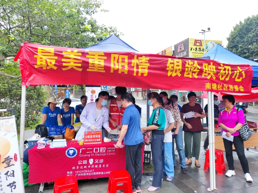 10月20日上午,广州荔湾区石围塘街道公共卫生委员会、南塘社区公共卫生委员会联合社区大党委山村联社、广二口腔、广医三院共同开展以“最美重阳情,银龄映初心”重阳节主题活动。