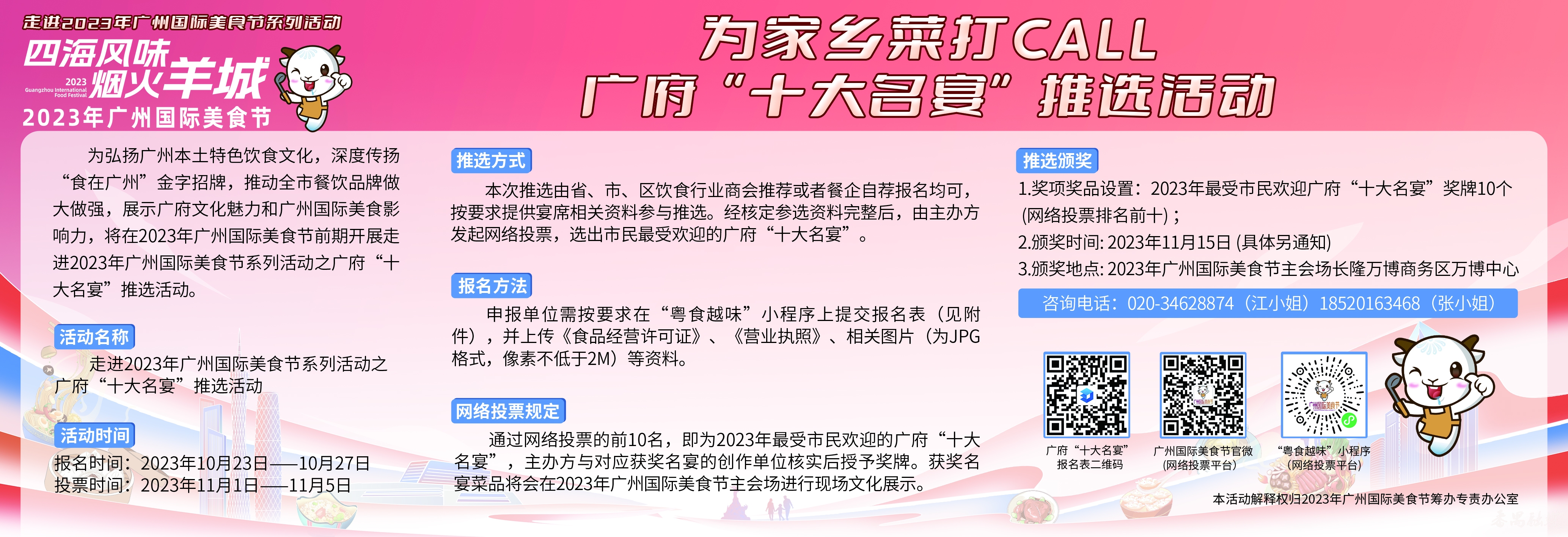 网络投票前10名即为2023年最受市民欢迎的广府“十大名宴”,主办方与对应获奖名宴的创作单位核实后授予奖牌。获奖名宴菜品将会在2023年广州国际美食节主会场进行现场文化展示,咨询电话:020-34628874(江小姐);18520163468(张小姐)。