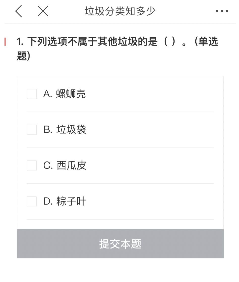 进入答题页面,答对十道垃圾分类单选题即可完成本关。