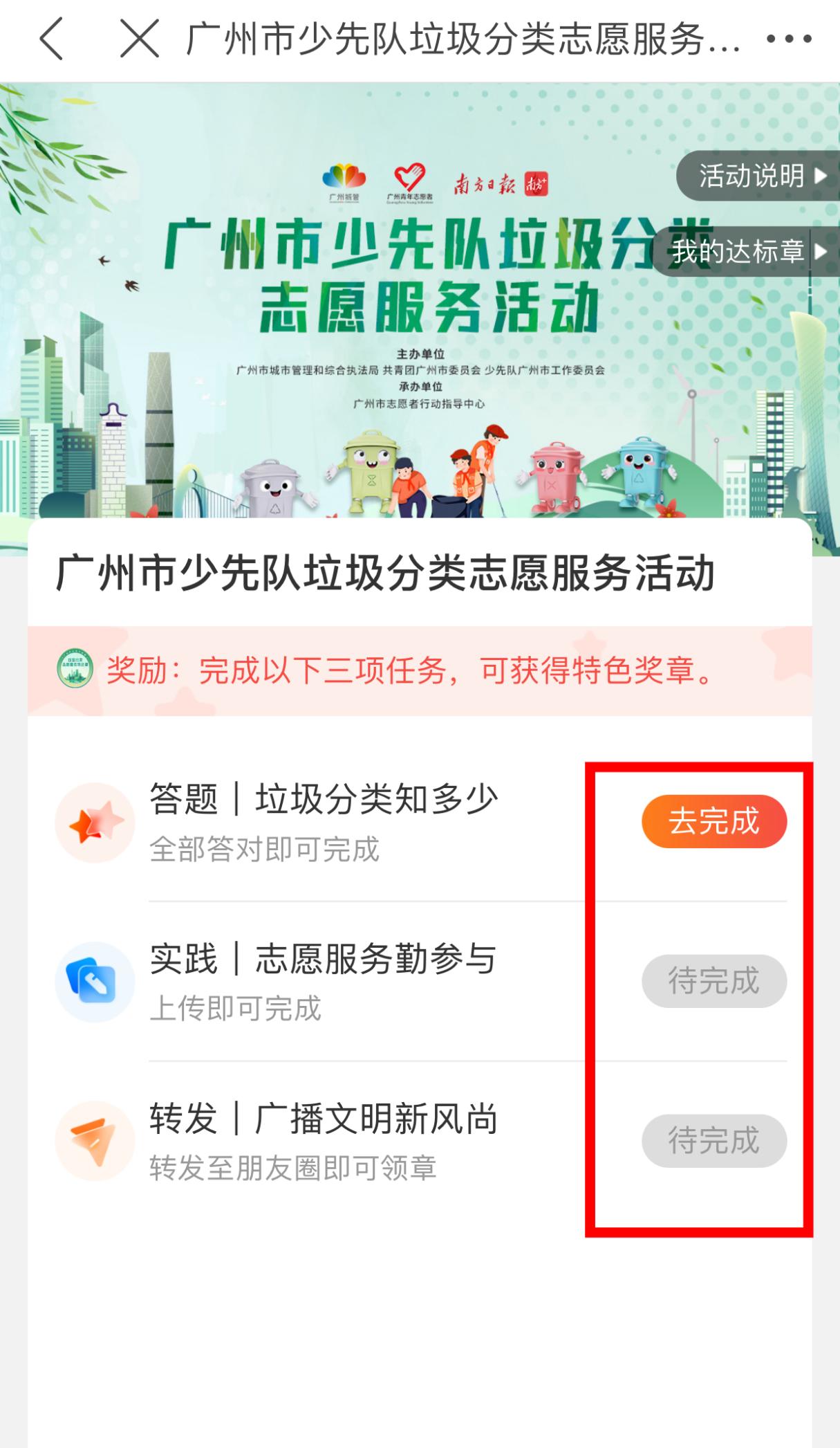 那么,同学们该如何获得“广州市红领巾奖章垃圾分类志愿服务特色章”呢?大家按照以下步骤操作即可: