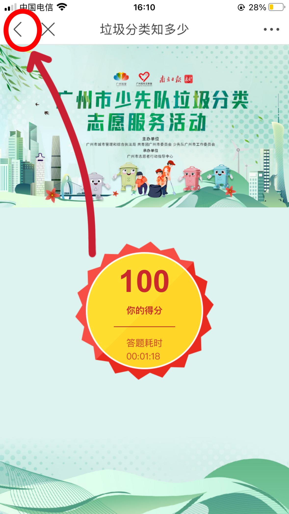 返回活动主页面,三个关卡按钮都已经显示“已完成”,上方会出现“领章”按钮,点击按钮即可领取“广州市红领巾奖章垃圾分类志愿服务特色章”。