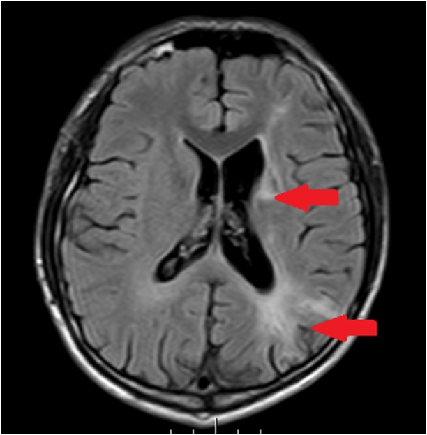 MRI提示:左侧额颞顶枕叶、基底节、侧脑室、胼胝体多发脑梗死。