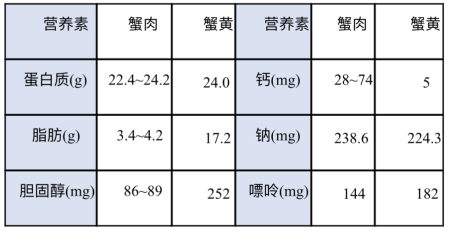 以下是每 100g 蟹肉和蟹黄(蒸熟的螃蟹)营养成分表