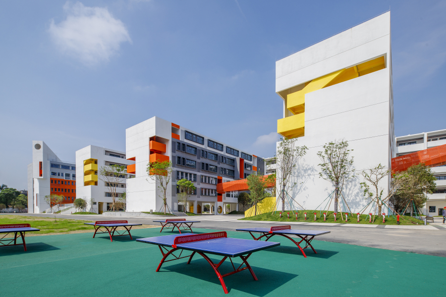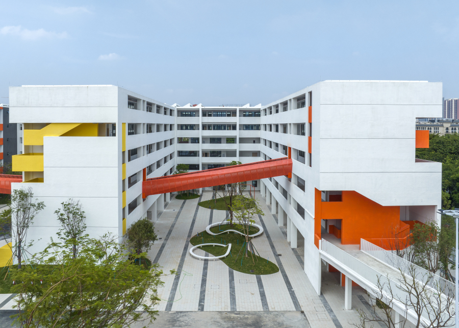 桂城街道金桂高级中学位于映月湖中央人文区,由桂城投资公司全资建设。学校用地面积约5.4万平方米,建筑总面积约8.4万平方米,可容纳2400个学生就读。学校整体建筑极具创意和设计感,且颜色鲜艳活泼,以红黄橙吸引眼球,现代风格明显,细节之处则充分融入佛山剪纸、铜凿金花灯等传统元素。教学楼之间以连廊串联,形成教学楼建筑群,配套48个普通教室和32个多功能场室。体育馆外形独特,内部体育场室和设施一应俱全,包括室内排球场、篮球场、恒温游泳池等。