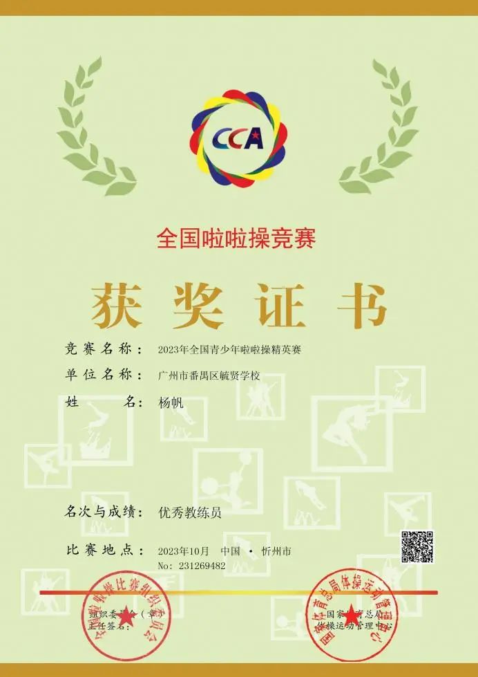 杨帆在全国啦啦操比赛获得“优秀教练员”称号。