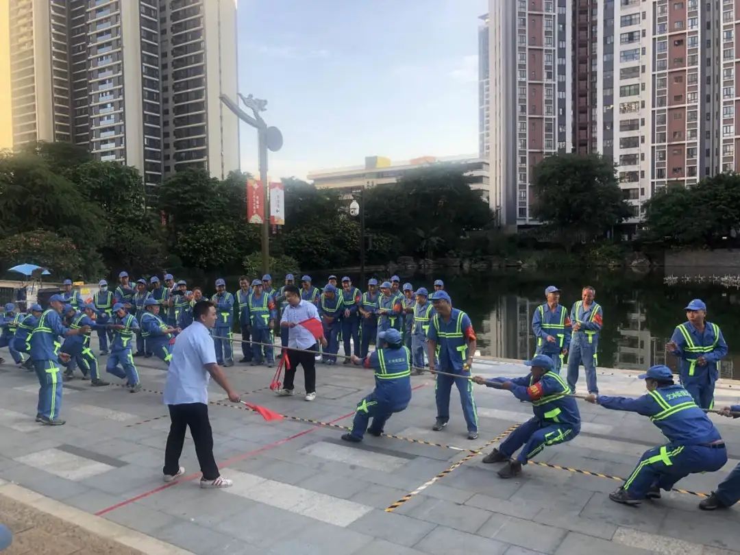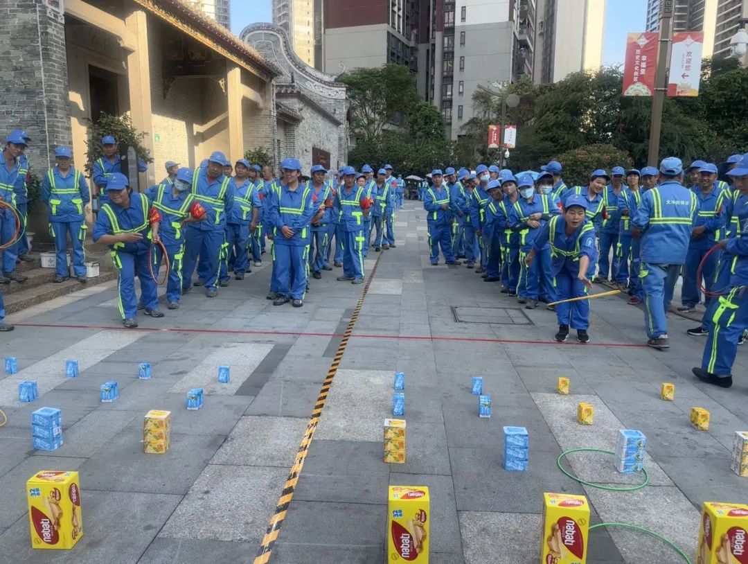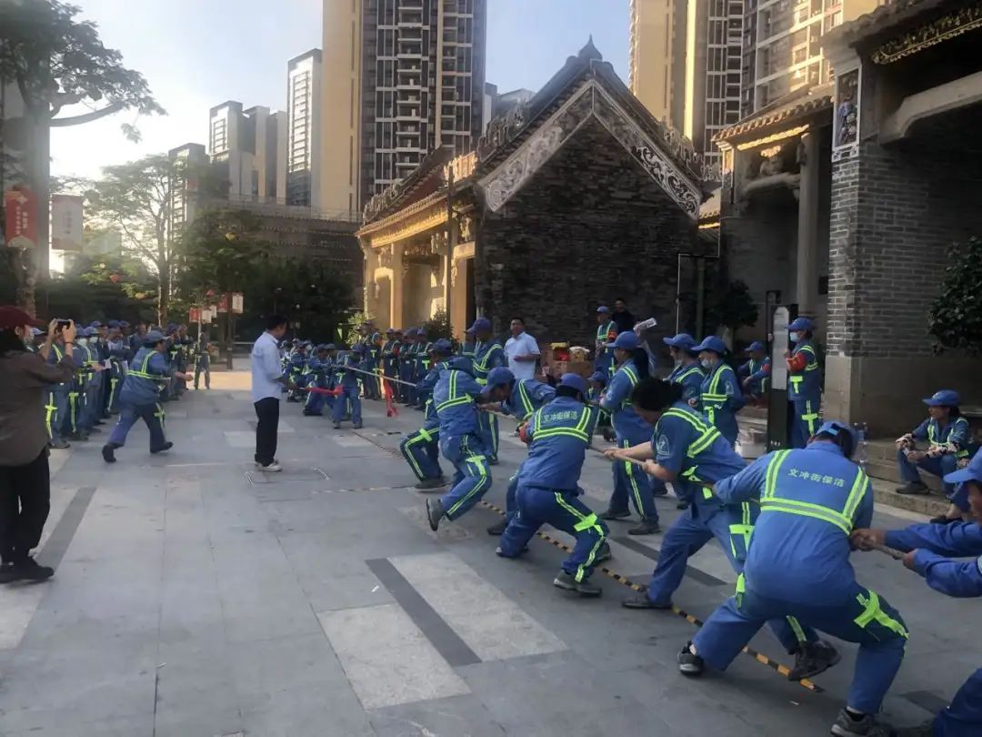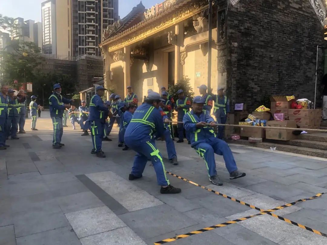 活动内容主要分为四个环节:表彰好人好事—慰问环卫职工—趣味小游戏—拔河比赛,趣味小游戏及拔河比赛环节设在“广州幸福里”。在古香古色建筑群中职工们激情高涨,积极参与到游戏中,脸上洋溢着幸福。