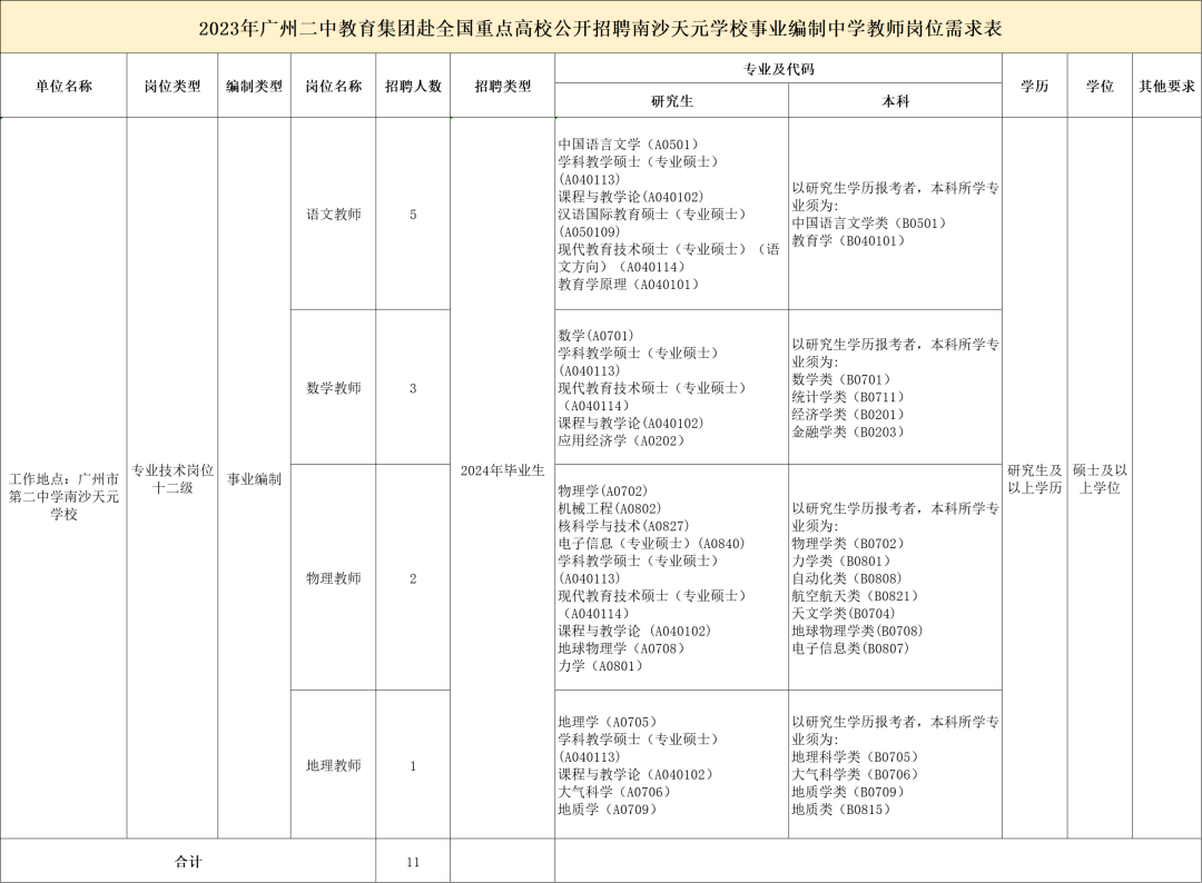 广州二中教育集团面向全国公开招聘事业编制中学教师11名(工作单位:广州市第二中学南沙天元学校)。详情如下: