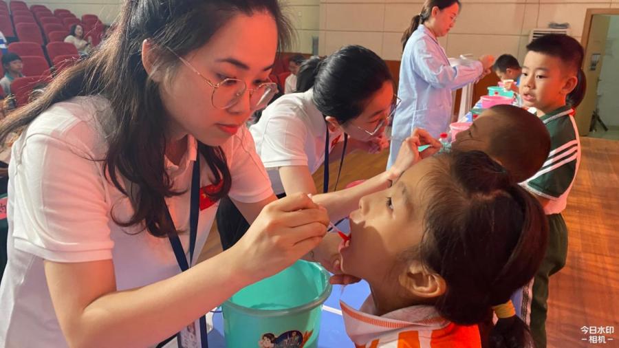 活动现场,同学们认真刷牙,评委从刷牙时间、顺序、力度、角度和清洁程度等多个方面进行综合评分,最终决出5名优秀“刷牙小能手”和20名“刷牙小能手”。