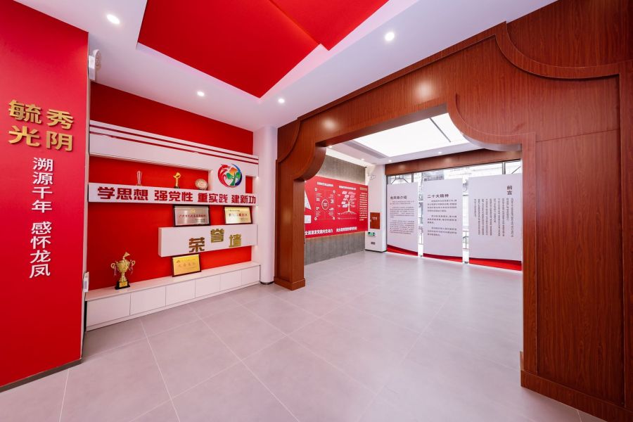 毓秀阁党建基地整体由五个组成部分——梧桐树庭院、时代精神长廊、毓秀家风广场、党建引领展馆、沉浸式体验馆。其中,党建引领展馆最为引人关注,该展馆围绕“党建引领龙凤发展”的核心主题,从毓秀初心、毓秀光阴、毓秀焕新、毓秀凤鸣和毓秀为民五个板块向人们讲述了龙凤街道的党建故事。