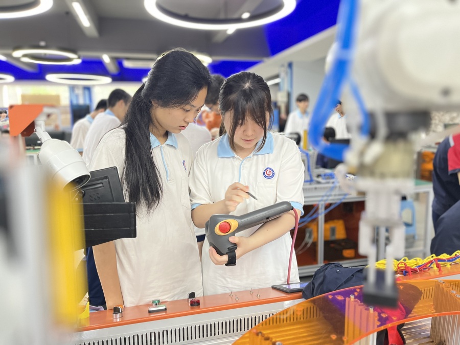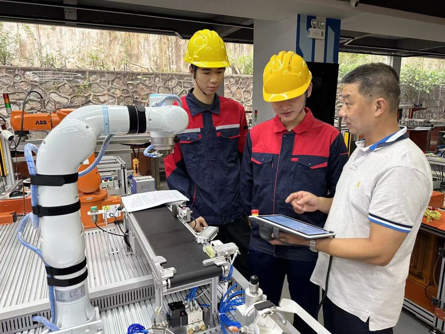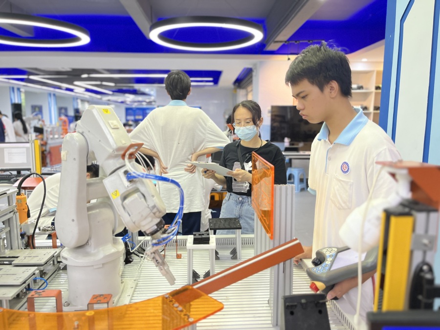 在广州轻职就读工业机器人技术应用专业究竟是一种什么体验?位于教学区一楼的教育部“工业机器人应用人才培养中心”是必去的“打卡点”。在那里,记者看到数十名工业机器人应用技术专业的学生正在进行实操训练,这是该专业学生的上课日常。