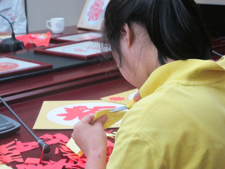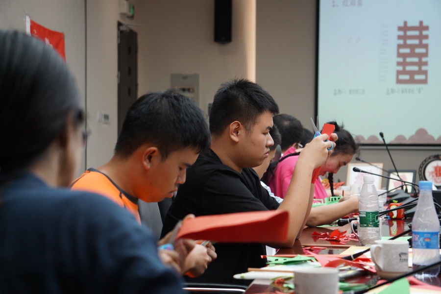 当一把把小剪刀小心或大胆地剪动起来,心青年(心智障碍青年)与健全初中同学们投入到自己手上的红纸,展开“想象的翅膀”,“雕琢”着一个个红“福”字,认真的脸慢慢被映红。