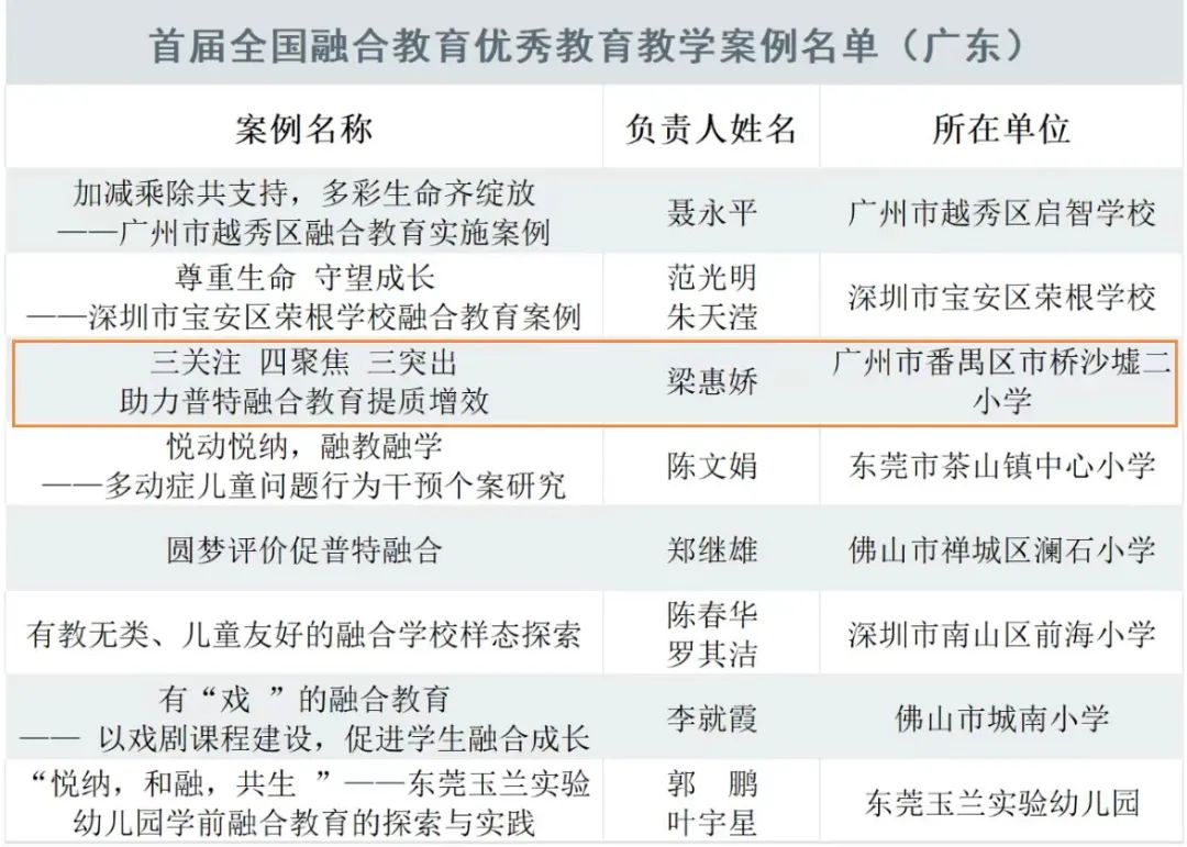 近日,教育部办公厅公布首届全国特殊教育教师教学基本功展示和融合教育优秀教育教学案例遴选活动结果。经各地申报、专家评审、公示,共有61项入选全国特殊教育教师教学基本功展示案例,广东省有4个案例入选;102项入选全国融合教育优秀教育教学案例,广东省有8个案例入选,其中,番禺区市桥沙墟二小学撰写的案例《三关注 四聚焦 三突出 助力普特融合教育提质增效》榜上有名。