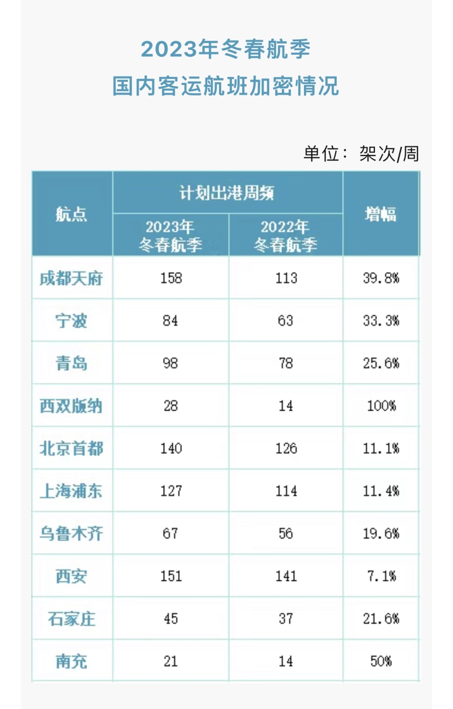 2023年冬春航季,白云机场国内客运共有24条航线计划加密,每周加密往返航班量432架次。其中,加密幅度最大的航线包括成都天府(由于部分航班转场)、宁波、青岛、西双版纳和北京首都。