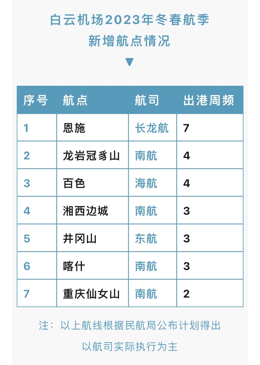 对比2022年冬春航季航班计划,白云机场2023年冬春航季新增7个定期客运航点,累计出港航班量26班/周,其中湘西边城、重庆仙女山为白云机场新增通航点。