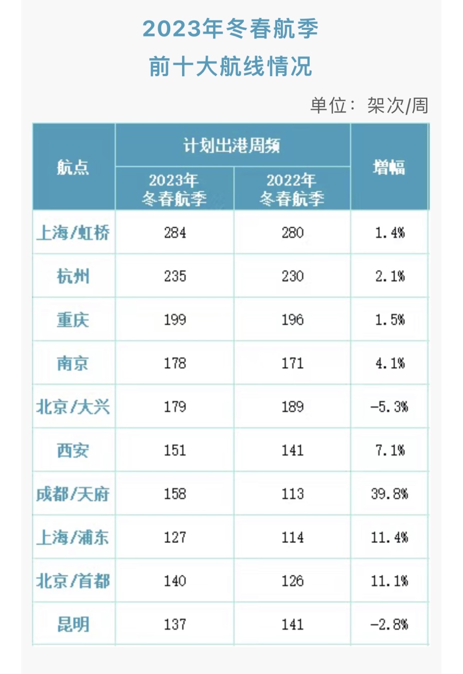 白云机场国内前十大航线(按照计划量排序)出港航班达到1788架次/周,同比2022年冬航季增长5.1%,其中成都/天府航线因转场原因增幅明显。