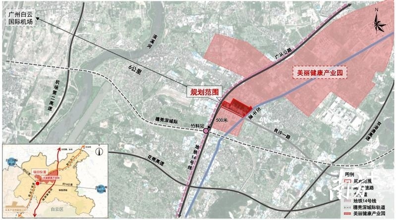 根据规划,项目地块位于白云区钟落潭镇中部、广州民营科技园美丽健康产业园范围内,距离白云国际机场约6公里,距离地铁14号线竹料站约500米。