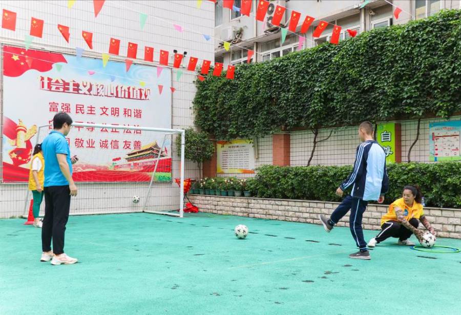 在一阵阵激昂的鼓乐声中,运动会在越秀区启智学校操场正式拉开序幕,一群可爱的特殊孩子们整列入场。与会嘉宾和32名来自广州市回民小学、越秀区红火炬小学、启智学校的学生通过“乐传足球”手牵手、脚传球为运动会开场。