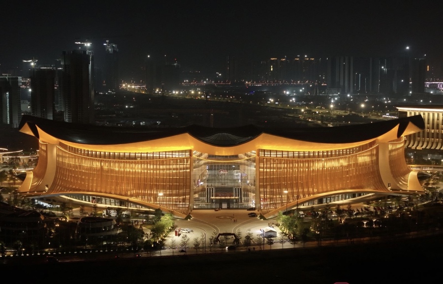 从外观上看,IFF永久会址国际会议中心线条流畅,这是因为幕墙创新采用国内首例3.9米宽幅悬浮式镂空PTFE网格膜。除了极具美感之外,PTFE网格膜透光率高达60%,因此站在国际会议中心大堂,既有充足采光,但又感受不到炎热。此外,水幕展厅采用张弦屋面结构加单边拉杆旋转坡道,实现大空间无柱张拉体系。同时,檐宇、骑楼等岭南元素均展现浓厚的中国美学,与现代化建筑完美融合。